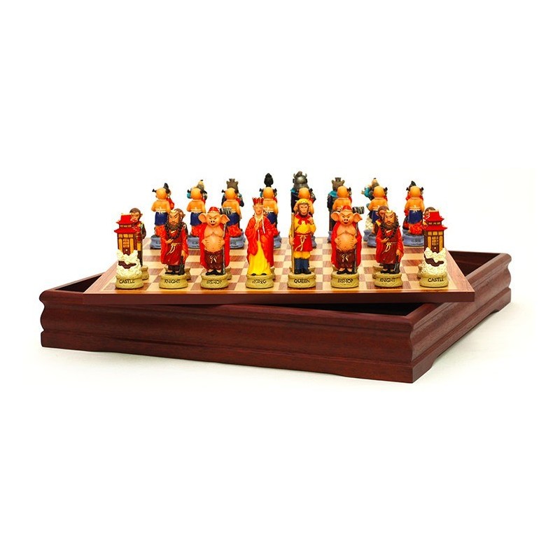 Piezas de ajedrez, Journey to the West. Conjunto de ajedrez completo, piezas y tablero, con figuras del famoso cuento chino del rey mono.